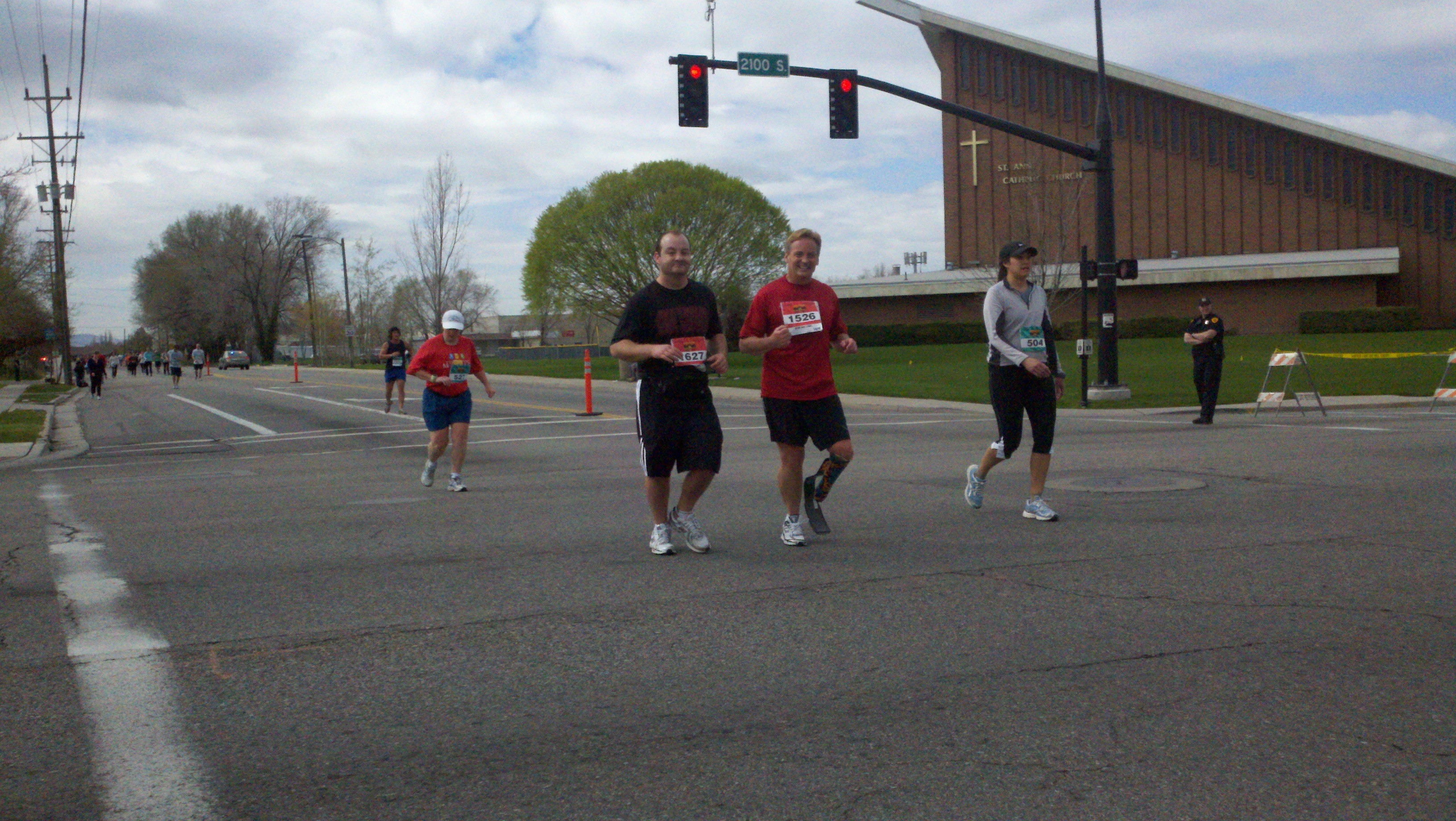 In April the weather in Salt Lake is a near perfect 75 degrees. The morning was a little chilly when we began but that’s alright because I knew it would heat up before too long. Dustin and I had a great start and we were really enjoying the run and having a great time. We met a lot of nice people along the way and even saw some people we knew. That never happens when you are running out of state. There were plenty of water stations along the course and no lack of portable restrooms either.