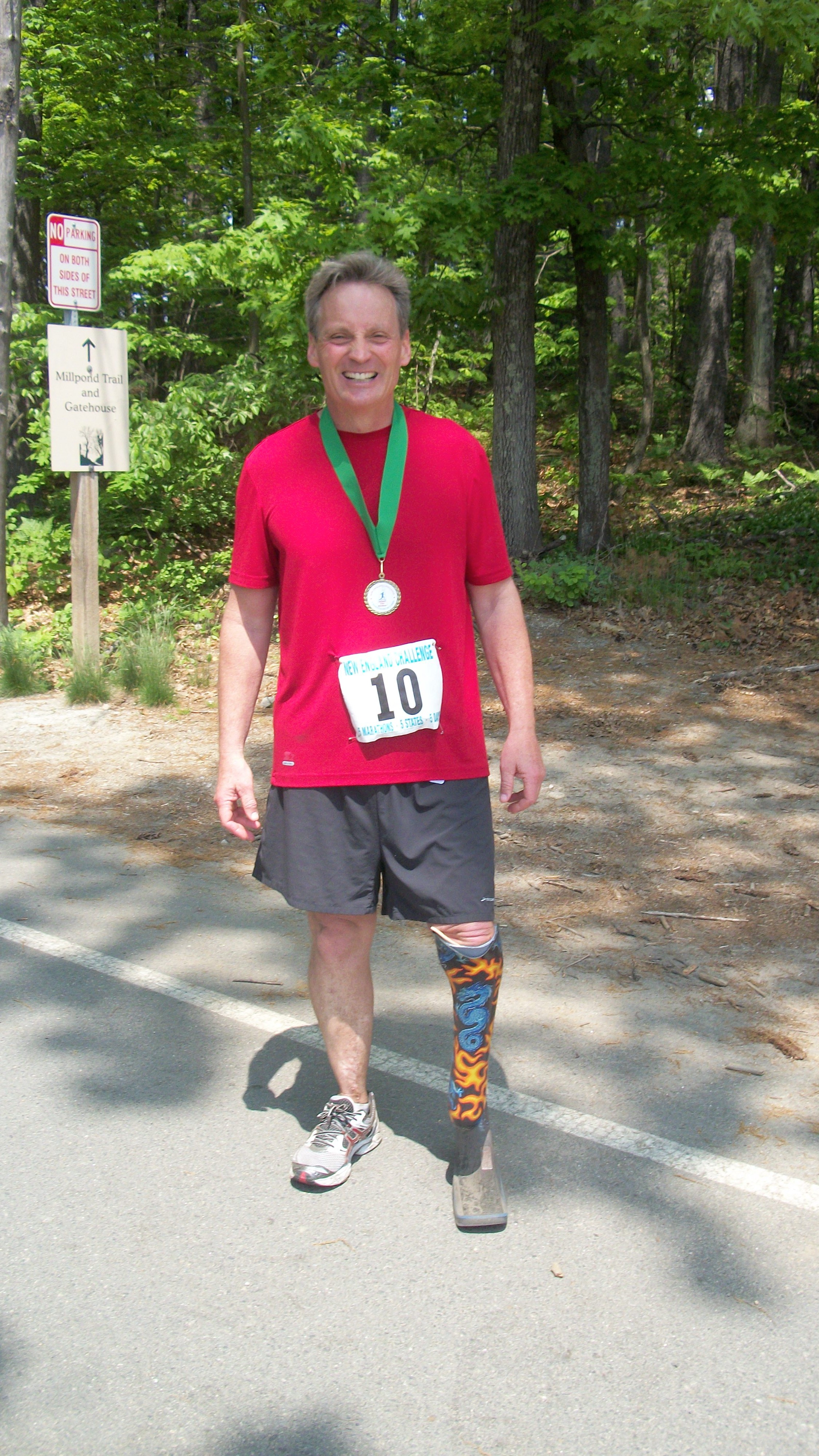 The second marathon in this series turned out to be a ‘trail run’ instead of the standard marathon. I usually try to avoid trail runs since my running blade doesn’t really do very well in sand and water and mud. I kept tripping on rocks and roots but the hardest part was the turning and twisting which gave me some pretty good bruising later. The trail was the most thickly forested of all the races and our entire group got lost on the first lap. Instead of going straight the lead guy turned right and like a bunch of lemmings we all followed. After about a mile and a half one of the race volunteers cut us off and had us all go back and take the left turn instead. I figured we ran about 3 extra miles.