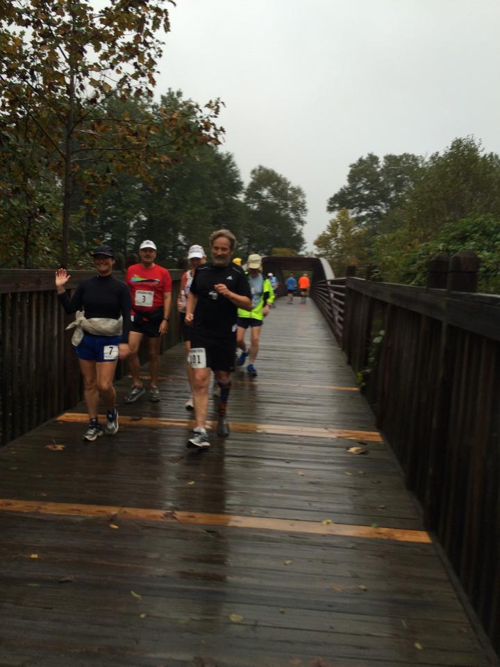 Race #4 Yes….you guessed it, it rained again. This was the most rain of all. Remember in the movie ‘Bowfinger’ when they talked about Chubby rain? This was Chubby rain. The course was flooded and it became almost comical. Some runners because of chaffing ran almost naked. No clothes=no chaffing. One couple put on goggles and flippers. I think they were hoping to count the race as a Triathlon. The heavy rain and wind was extremely fatiguing and all I longed for was dry clothes and hot food. We had been warned that if the lighting didn’t stop there was a possibility of the race being cancelled at the half way point. Thank goodness the lightening stop. Sad the rain continued.